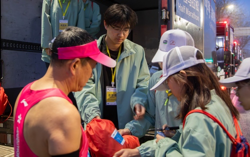 赛事期间,志愿者们坚守存衣、引导、秩序维护、终点取包指引等多个岗位。5点30分存衣服务正式启动,志愿者耐心引导选手完成存包流程,细致核对信息;面对7点的存包高峰期,大家从容应对、高效协作,全力保障现场秩序。赛事后半程,志愿者们迅速转场至博物院南广场半程终点,为完赛选手提供取包指引、暖心问候等服务,用贴心的举动缓解选手疲惫,让跑者感受到来自学院学子的温暖与善意。